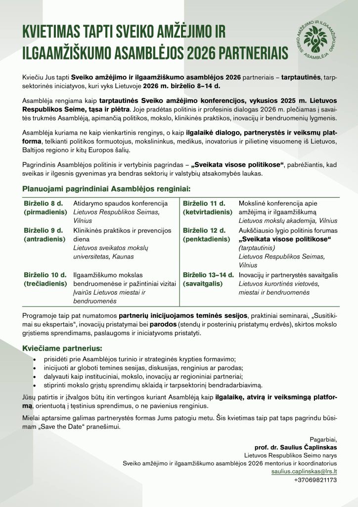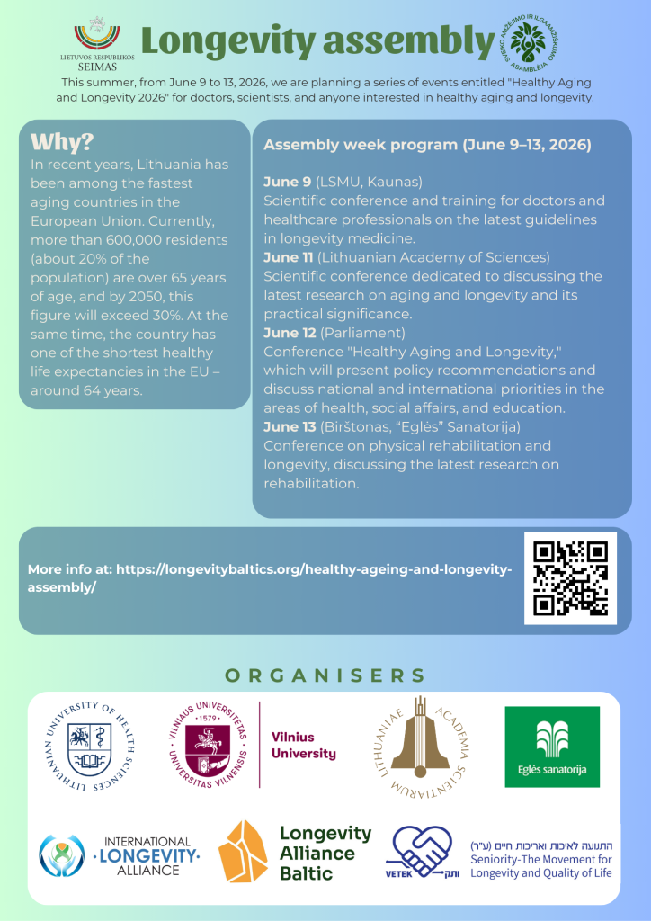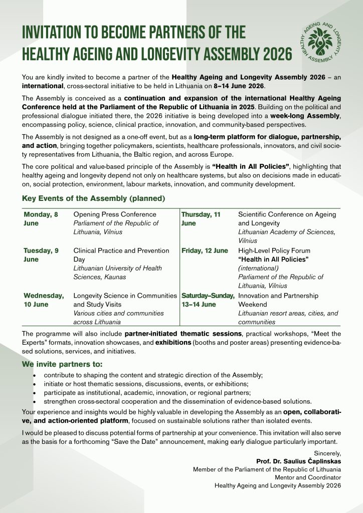 Building on the ideas and conclusions of the international conference “Towards Healthy Longevity,” held in the Seimas of the Republic of Lithuania on 19 September 2025, the next stage – the “Healthy Ageing and Longevity Assembly 2026,” will take place on 8–14 June 2026 in Lithuania.
